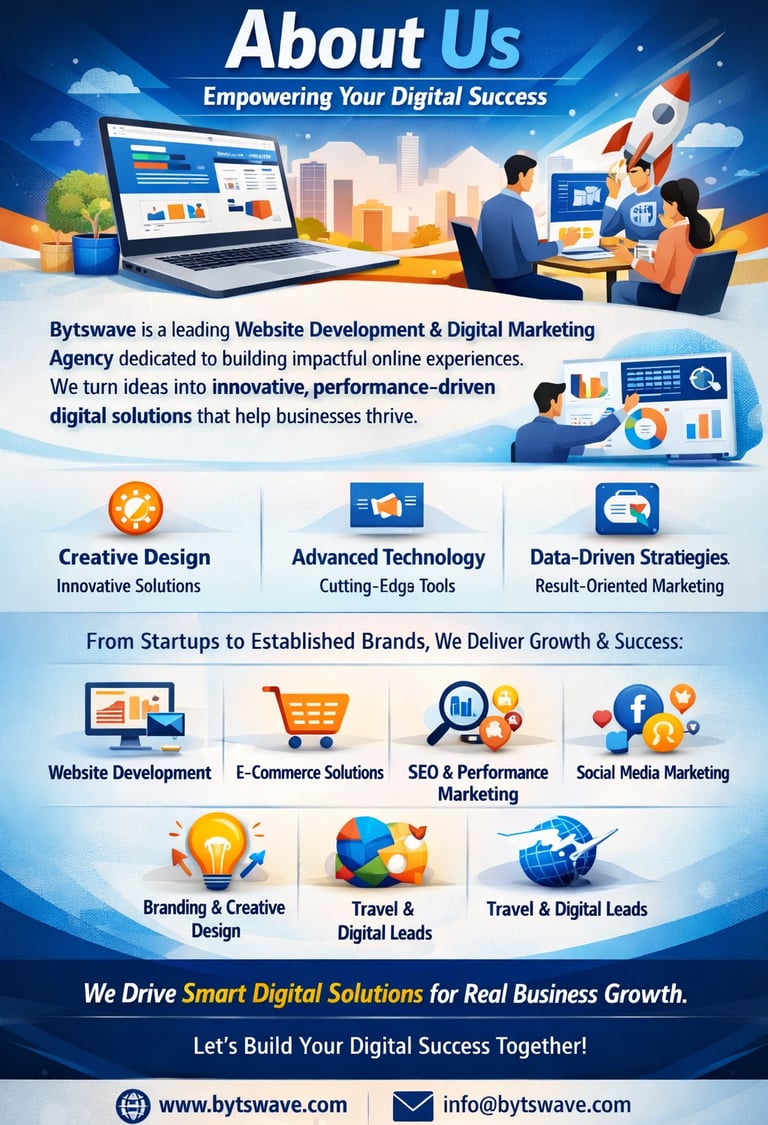 Bytswave is a forward-thinking website development and digital marketing agency dedicated to helping businesses build a strong and impactful digital presence. We specialize in creating innovative, performance-driven digital solutions that empower brands to grow, engage their audience, and achieve measurable success in the online world.